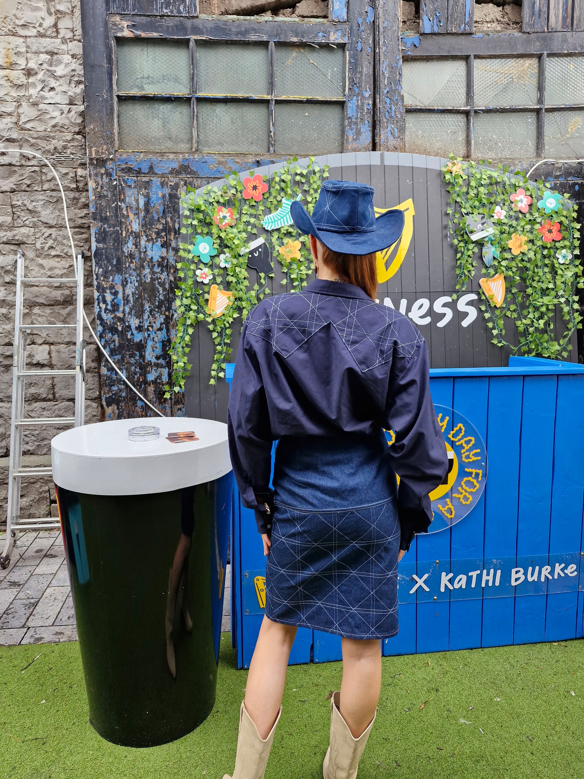 This tailored skirt is a perfect pairing with the shirts in this collection. Featuring a larger scale embroidered of the cane-work pattern, the cut of the skirt mimics the sleek lines of the embroidery. Pearl top snaps close the skirt in the front, creating an asymmetric detail. Its length sits just above the knee, which allows for it to be dressed up or down, depending on where you are going.